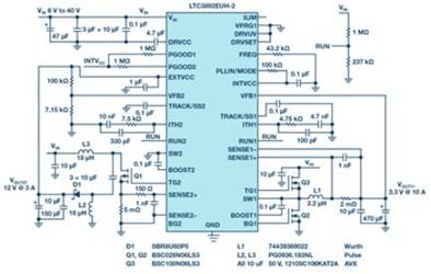 圖1. LTC3892的電氣原理圖,可產(chǎn)生正負(fù)電壓。VOUT1為10 A、3.3 V,VOUT2為3 A、-12 V。