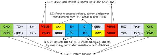 舊版 USB D+ 和 D- 線:Type-C 連接器向后兼容以前的 USB 標準到 USB 2.0,因為 D+ 和 D- 線可用。定義了兩組 USB 2.0 信號引腳以啟用電纜翻轉功能。
