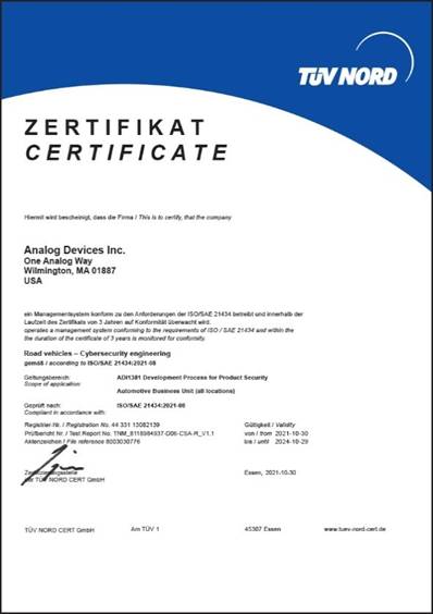 ADI公司預(yù)料到了ISO/SAE 21434標(biāo)準(zhǔn)在草案期間解決的核心網(wǎng)絡(luò)安全問(wèn)題,并在wBMS設(shè)計(jì)和開發(fā)過(guò)程中采納了相關(guān)應(yīng)對(duì)措施。目前,ADI是首批在政策和流程方面實(shí)現(xiàn)ISO/SAE 21434合規(guī)性的技術(shù)供應(yīng)商,ADI wBMS技術(shù)正在接受最高網(wǎng)絡(luò)安全保障等級(jí)認(rèn)證。