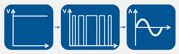 電流調(diào)節(jié)是通過一種叫做PWM的技術(shù)實(shí)現(xiàn)的(脈寬調(diào)制)。電壓是可以通過使用MOSFET實(shí)現(xiàn)非?焖俚拇蜷_和關(guān)閉,以致電流在一個(gè)所需的水平浮動(dòng)。但這種電流控制方法不適用于簡單的電阻負(fù)載--電流調(diào)節(jié)只能在驅(qū)動(dòng)線圈和磁鐵或其他線圈一起使步進(jìn)電機(jī)旋轉(zhuǎn)時(shí)實(shí)現(xiàn)。線圈-電感-有一個(gè)有趣的特性---它“減緩”了電流,為其加上“慣性”。這意味著,如果施加電壓,流過電感的電流不會(huì)立即上升,而是緩慢上升。當(dāng)電壓被切斷時(shí),同樣的事情還會(huì)發(fā)生——電流不會(huì)立即降到0A,而是會(huì)隨著時(shí)間的推移而減少。