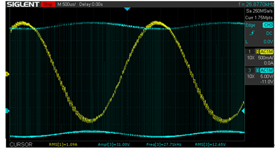 黃色曲線表示通過電機(jī)線圈的電流,青色線表示正在接通/斷開的電壓.該測量是在待機(jī)期間進(jìn)行的,此時(shí)電機(jī)不旋轉(zhuǎn),但保持其位置.電流幾乎是恒定的,電壓有規(guī)律地在短時(shí)間內(nèi)打開,然后再關(guān)閉.請注意,這種切換正在發(fā)生超過30000次每秒!