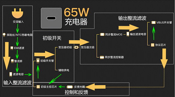 以某款65W單口手機(jī)充電器為例,主要包括輸入整流濾波、控制和反饋、初級(jí)開關(guān)、輸出同步整流,輸出濾波等四個(gè)部分組成,每個(gè)部分的詳細(xì)組成如圖1所示。