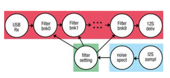 傳遞的部分需要緩沖一個立體聲樣本。將 10 個過濾器線程作為管道運(yùn)行需要 11 個緩沖區(qū)。這意味著從接收器到編解碼器的總延遲包括 24 個采樣時間,即 500 µs,并且可以添加一個額外的采樣以應(yīng)對時鐘恢復(fù)算法中的中期抖動。這部分以 48 kHz 運(yùn)行。