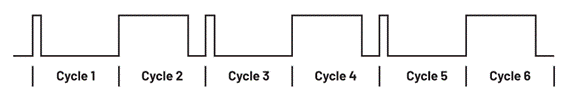 但是,除了提到的優(yōu)點以外,該穩(wěn)壓器也有缺點。在進行開關轉換之后,電流模式穩(wěn)壓器無法立刻實施所需的電流測量,因為如果在此時進行測量,測量結果中會包含大量噪聲。需要等待幾nS,等開關引起的噪聲減弱。這段時間被稱為消隱時間。這通常導致其最短導通時間略長于電壓模式穩(wěn)壓器的最短導通時間。電流模式穩(wěn)壓器的另一個缺點是其可能產(chǎn)生次諧波振蕩。如圖3所示。如果所需的占空比大于50%,電流模式穩(wěn)壓器可能交替執(zhí)行短脈沖和長脈沖。在許多應用中,這被認為是不穩(wěn)定的,需要加以避免。為了避免這種不穩(wěn)定性,可以向圖1所示的生成的電流斜坡添加一定的斜坡補償。這樣可以將關鍵占空比閾值調節(jié)到遠高于50%,保證在更高占空比下,也不會發(fā)生次諧波振蕩。