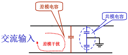 在電路中引入共模電容,則共模電容提供最短的路徑使共模干擾信號(hào)被旁路,從而抑制共模干擾的產(chǎn)生。如果電源回路同時(shí)還存在差模干擾,使用差模電容來抑制干擾。