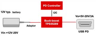 下圖所示的是TPS55289在USB PD中的應用框圖,它能夠滿足USB PD標準協議,可通過I2C實現與PD控制器的通信。并且,它有著極高的能量轉化效率,在輸入12V、輸出20V/3A的條件下,效率能夠達到96%。TPS55289還是一款四管集成的buck-boost,能夠在很大程度上節(jié)省板級空間,非常適用于個人電子產品的小型化設計。