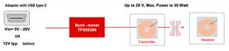 同樣,TPS55289也適用于無線充電,下圖是該應用的示例框圖。TPS55289的頻率能夠達到2MHz,使得開發(fā)者可以使用更小的外圍器件完成設計,從而減小整體解決方案的尺寸,并且節(jié)省BOM成本。此外TPS55289支持I2C協議,可以通過I2C調節(jié)輸出電壓。