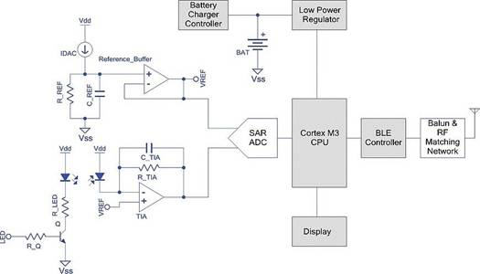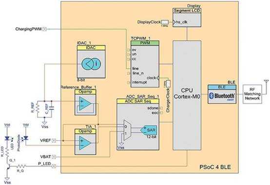 對于此應(yīng)用,控制器外部唯一需要的外部元件是一些無源元件,一個用于驅(qū)動LED的晶體管,以及RF匹配所需的元件。集成其他組件的一個優(yōu)點是對系統(tǒng)電源的更好控制。例如,開發(fā)人員可以在不使用模擬前端時將其禁用。