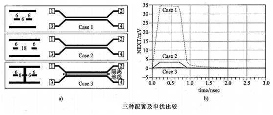 要想加入保護地線,首先必須把兩個信號線的間距拉開到足以容納一根保護地線的空間,由于拉開了信號線的間距,即使不插入保護地線,也會減小串擾。插入保護地線會有多大的作用?
