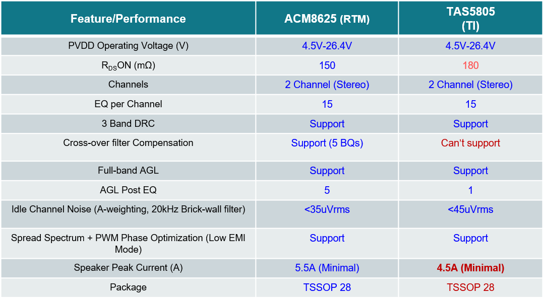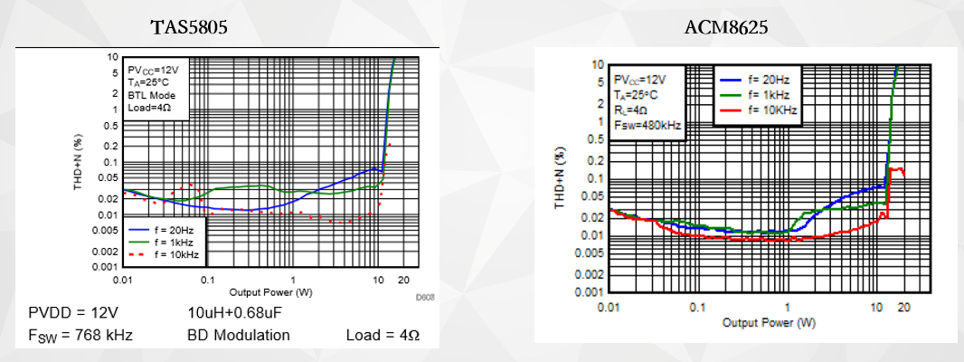| TAS5805和ACM8625在性能方面的比較 |