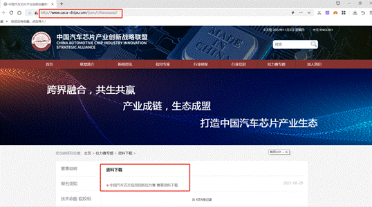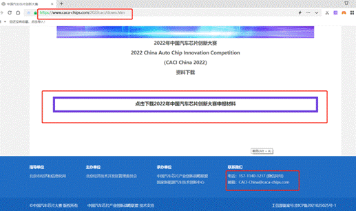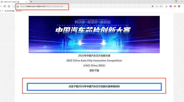 2022年11月1日-2022年11月14日;大賽線上和線下相結(jié)合,同步進行申報材料征集;報名方式:登錄賽事官方網(wǎng)站中國汽車芯片產(chǎn)業(yè)創(chuàng)新戰(zhàn)略聯(lián)盟(見圖1)、國家新能源汽車技術(shù)創(chuàng)新中心賽事官方網(wǎng)站(見圖2)下載申報材料模板,按要求填寫后提交至指定郵箱。