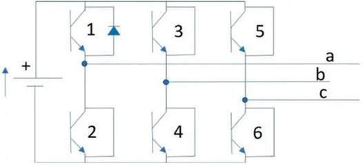 有刷直流電機(jī)使用機(jī)械換向,無刷直流電機(jī)與此不同,采用電子換向。這意味著電機(jī)的相位,根據(jù)轉(zhuǎn)子相對(duì)于定子的位置依次通電和斷電。對(duì)于三相無刷直流電機(jī),驅(qū)動(dòng)器由六個(gè)電子開關(guān)(通常為晶體管)組成,通常稱為三相H 橋(圖1)。此配置允許三個(gè)雙向輸出,為電機(jī)的三相通電。