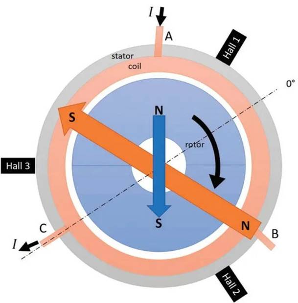 圖 2 :無槽無刷直流電機(jī)的橫截面示意圖。藍(lán)色 區(qū)域是帶有兩極永磁體的轉(zhuǎn)子。磁鐵產(chǎn)生的磁場(chǎng) 由藍(lán)色箭頭表示。橙色區(qū)域?yàn)槿嗬@組。當(dāng)電流 從 A 相流向 C 相時(shí)會(huì)產(chǎn)生磁場(chǎng),由橙色箭頭表 示,以便于簡(jiǎn)化。當(dāng)兩個(gè)箭頭對(duì)齊時(shí),轉(zhuǎn)子將旋 轉(zhuǎn)。驅(qū)動(dòng)器變換相位(旋轉(zhuǎn)定子磁場(chǎng),橙色箭頭), 以確保定子和轉(zhuǎn)子磁場(chǎng)之間盡可能保持 90 度(產(chǎn) 生最大扭矩)。