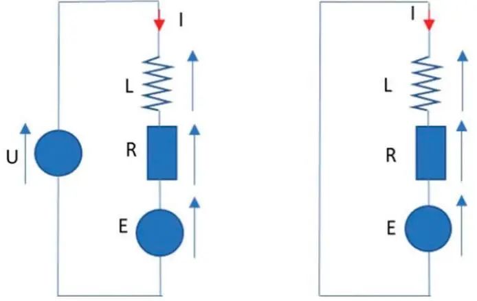 直流電機(jī)的特點(diǎn)是電感L、電阻R 和反電動(dòng)勢(shì)E 串聯(lián)。反電動(dòng)勢(shì)是由磁感應(yīng)(法拉第- 楞次感應(yīng)定律)產(chǎn)生的電壓,它與施加的電壓相反,并且與電機(jī)速度成正比。圖8 顯示了PWM 接通和PWM 斷開時(shí)的電機(jī)。