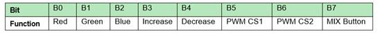 B5和B6 bit負(fù)責(zé)選擇PWM信號(hào)將通過的引腳(顏色):這些bit的顏色指定如表3所示。最后一個(gè)bit B7負(fù)責(zé)激活自動(dòng)混合功能。