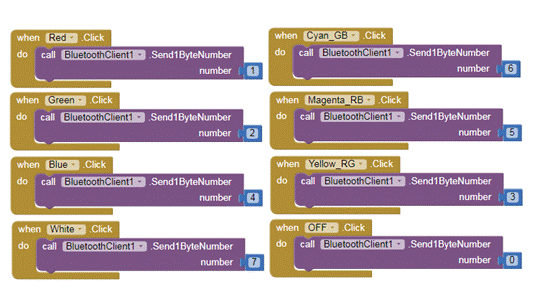 在本節(jié)中,我們將創(chuàng)建一個(gè)安卓應(yīng)用程序,它將監(jiān)測和顯示用戶的控件選擇。界面由兩部分組成:第一部分包含一組具有預(yù)定義顏色的按鈕,因此當(dāng)按下這些按鈕中的任意一個(gè)時(shí),相應(yīng)顏色的LED會(huì)亮起。第二部分(MIX方塊)為用戶創(chuàng)建混合顏色。