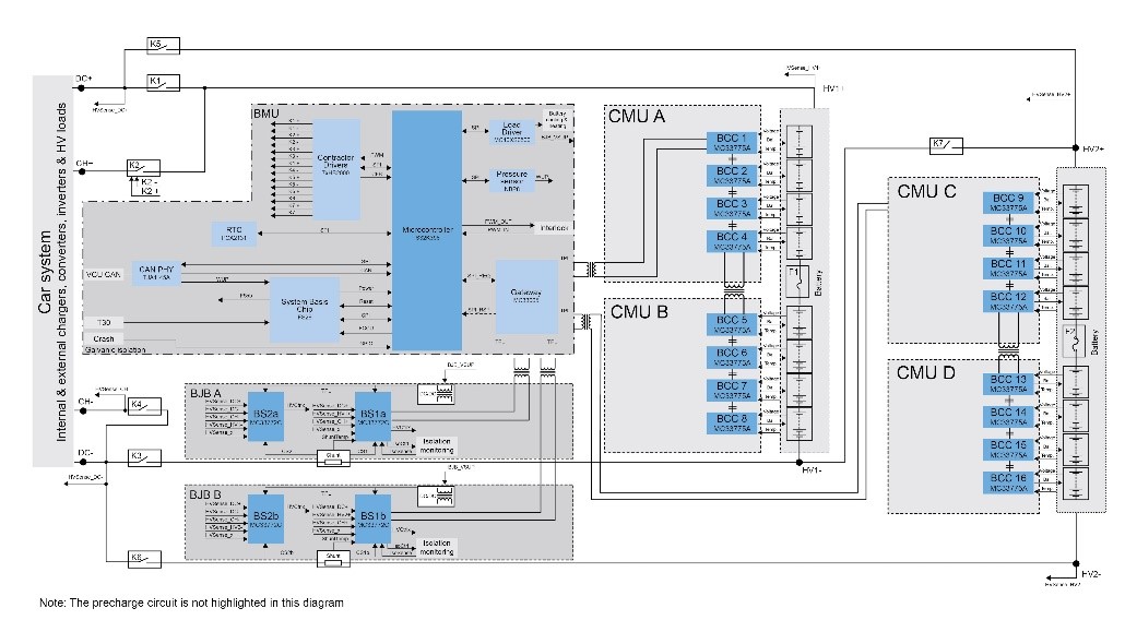 上圖顯示了電動(dòng)汽車動(dòng)力的關(guān)鍵系統(tǒng)。圖中為主高壓(HV)電池及其管理系統(tǒng)。低電壓(LV)側(cè)為鉛酸電池或鋰電池,電壓通常為12~14 V,可以提供車內(nèi)照明、門鎖、導(dǎo)航和駕駛輔助系統(tǒng)所需的較低電壓。12V電池還可作為備用電源,在主高壓電池?zé)o法供電的情況下接管關(guān)鍵安全功能,如轉(zhuǎn)向。