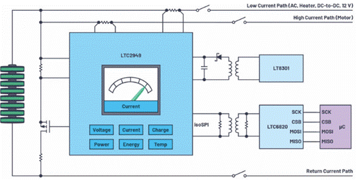 EV電池組監(jiān)視器是專為EV設(shè)計(jì)的高精度電流、電壓、溫度、電荷、功率和電能表。通過測量這些關(guān)鍵參數(shù),系統(tǒng)設(shè)計(jì)人員具備了計(jì)算整個(gè)電池組的實(shí)時(shí)SOC和SOH以及其他品質(zhì)因數(shù)的基本要素。圖 2 示出了用于高端電流檢測配置的 LTC2949 的框圖。其中,LTC2949采用可調(diào)浮動拓?fù)洌蛊淠軌虮O(jiān)控非常高電壓的電池組,不受其自身14.5 V額定電壓的限制。LTC2949 的電源通過一個(gè)具有 V 的LT8301隔離式反激式轉(zhuǎn)換器提供抄送連接到電池正極。