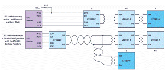 標(biāo)準(zhǔn)SPI接口可用于直接MCU連接,isoSPI接口提供標(biāo)準(zhǔn)芯片級SPI的物理層適配,釋放出經(jīng)濟(jì)高效的分布式封裝架構(gòu)的全部潛力。isoSPI 專為高電壓和高噪聲系統(tǒng)而設(shè)計(jì),僅使用一根雙絞線電纜和一個(gè)簡單的脈沖變壓器,即可在長達(dá) 100 米的電纜上提供高達(dá) 1 Mbps 的安全、可靠的信息傳輸。isoSPI也比其他板載隔離解決方案便宜。圖3顯示了如何利用isoSPI作為菊花鏈或可尋址并行配置中的最后一個(gè)元件的架構(gòu)。