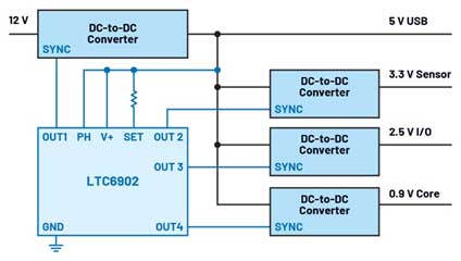 圖3顯示了圖1中采用LTC6902多相振蕩器的電源架構(gòu)。它由5V電壓供電。該電壓由一個(gè)將12V轉(zhuǎn)換為5V的降壓轉(zhuǎn)換器產(chǎn)生。對(duì)于開關(guān)穩(wěn)壓器,如果它們首先使用自己的內(nèi)部振蕩器獨(dú)立啟動(dòng),然后再提供外部時(shí)鐘,則一般不會(huì)有問(wèn)題。詳細(xì)信息可在相應(yīng)開關(guān)穩(wěn)壓器的數(shù)據(jù)手冊(cè)中找到。