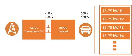 另一個影響設計和功率器件額定電壓的重要因素是架構(gòu)中的級數(shù)。6個開關(guān)的拓撲結(jié)構(gòu)是一個2級架構(gòu),通常用900 V或1200 V的開關(guān)來實現(xiàn)快速直流電動車充電器。這里SiC MOSFET-模塊具有低RDS on(6-40 mQ)區(qū)域的首選解決方案,特別是對于每塊15 kW以上的高功率范圍。