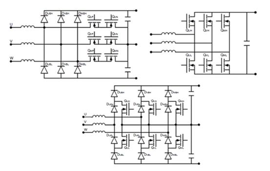 圖2.用于DCFC的典型PFC升壓拓撲結(jié)構(gòu).T-NPC(左上)、6開關(guān)(右上)和I-NPC(底部)
