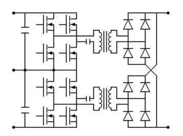 帶有次級同步整流拓撲結(jié)構(gòu)的DAB-ZVT轉(zhuǎn)換器也非常典型。這些都是用PWM工作,一般來說,需要比LLC轉(zhuǎn)換器更簡單的控制。DAB可以被認為是傳統(tǒng)的全橋移相ZVT轉(zhuǎn)換器的演變,但漏電感器在初級端,這簡化了繁瑣的次級端整流,減少了二次開關(guān)或二極管的必要額定擊穿電壓。由于實現(xiàn)了ZVT,這些轉(zhuǎn)換器可以在很寬的輸出電壓范圍內(nèi)提供穩(wěn)定的高能效。這對于支持800 V和400 V電池電壓水平的充電器來說是個方便的因素。DAB的PWM工作帶來了好處。首先,它傾向于使轉(zhuǎn)換器的電磁干擾(EMI)頻譜比調(diào)頻系統(tǒng)中的更緊密。此外,用固定的開關(guān)頻率,系統(tǒng)在低負載時的行為更容易解決。通過同步整流,DAB是一種雙向的原生拓撲結(jié)構(gòu),是快速電動汽車充電器的最通用的替代方案和合適的解決方案之一。