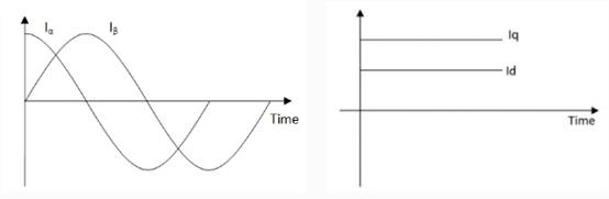 圖1:用克拉克變換(Iα和Iβ)投影三相電流,然后通過帕克變換投影到線性d,q旋轉(zhuǎn)參照坐標(biāo)系
