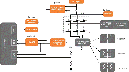 圖2顯示了使用正交編碼器的有傳感器FOC實(shí)施所需的信號(hào)。反饋至少需要1-3個(gè)電流檢測輸入(取決于分流架構(gòu))到ADC和正交A/B/Z信號(hào)的3個(gè)GPIO引腳。還必須為編碼器供電。