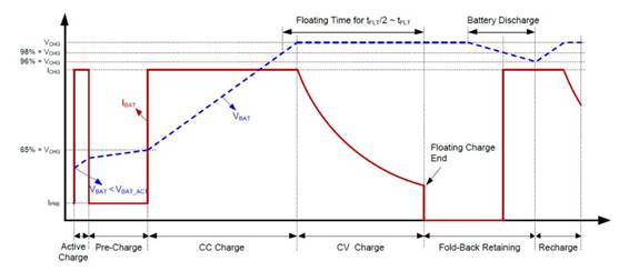 除常規(guī)的預(yù)充電、恒流充電、恒壓充電階段外,SGM41566 還具有特殊設(shè)計的深度放電電池激活充電功能 (Active Charge) 和在電池充滿后的安全電壓回退功能 (Fold-Back Retaining)。當(dāng)電池電壓低于深度放電激活檢測門限時,SGM41566 會以恒流充電電流 ICHG 給電池充電 12.5ms,以快速激活電池,此后會自動進入預(yù)充電階段。滿電安全電壓回退功能則對延長長期掛載設(shè)備的電池壽命有極大的幫助。