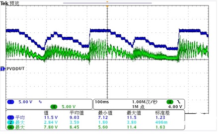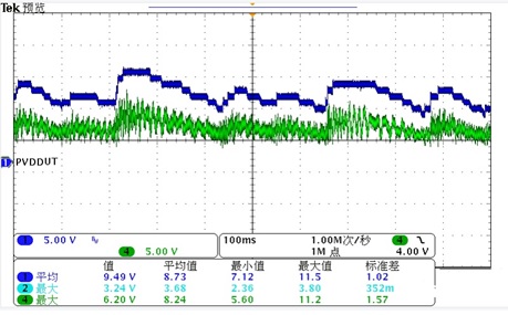 下圖來展示一下ACM3108,在CLASS H功能下,PVDD的變化。下圖藍色是DCDC的PVDD,綠色是音頻輸出信號。
