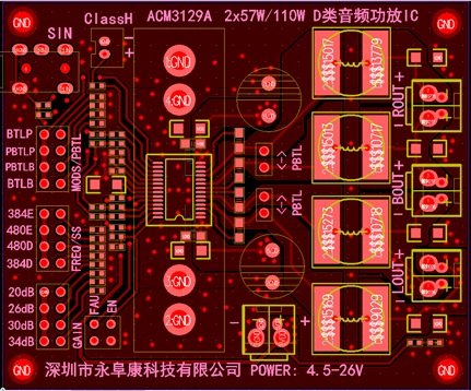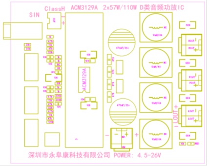 ACM3129 2×57W, 1% THD+N, 24V, 4Ω, BTL ; 1×110W, 1% THD+N, 24V, 2Ω, PBTL TSSOP-28(散熱片在背部,支持外接散熱器) 4.5V-26.4V 2×57W/110W高性能D類音頻功放,超低功耗、展頻功能、動態(tài)調(diào)整升壓Class H