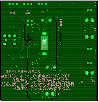 ACM3108 2×25W, 1% THD+N, 16V, 4Ω, BTL ; 1×50W, 1% THD+N, 16V, 2Ω, PBTL AD52068/TPA3110 TSSOP-28 4.5V-16V 動態(tài)調(diào)整升壓CLASS H功能、25W雙聲道/50W單聲道D類音頻功放IC