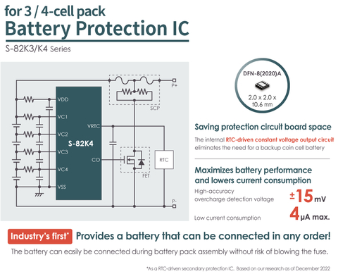 今天推出的S-82K3/K4系列3至4串電池保護(hù)IC (二次保護(hù))具有以下三個(gè)特點(diǎn):