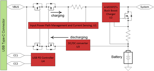 由于能夠從幾乎任何輸入源為電池充電并滿足 Type-C 和 PD USB 適配器的需求,升降壓充電器近年來變得越來越流行。USB Type-C 廣泛采用的一個關(guān)鍵優(yōu)勢是通向通用適配器和相應(yīng)減少電子垃圾的現(xiàn)實途徑。高功率密度降壓-升壓充電器不僅應(yīng)集成通用功能充電模塊,還應(yīng)集成DC/DC 轉(zhuǎn)換器等其他模塊,以簡化系統(tǒng)設(shè)計。圖 2顯示了 USB PD 充電解決方案的系統(tǒng)框圖。