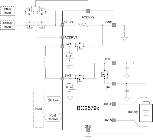 圖 3所示的完全集成的升降壓充電器可以簡化 USB PD 充電解決方案的系統(tǒng)范圍設(shè)計。作為輸入過壓和過流保護(hù)電路的一部分,外部背對背 MOSFET 的控制邏輯和驅(qū)動電路也集成到充電器中。這些功能消除了框圖中支持輸入電源路徑管理和輸入電流檢測的單元。