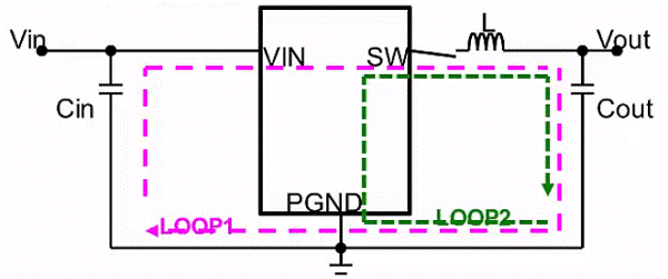 下圖中紅色LOOP1為DC-DC高邊管導(dǎo)通,低邊管關(guān)閉時的電流流向;綠色LOOP2的為高邊管關(guān)閉,低邊管開啟時的電流流向;