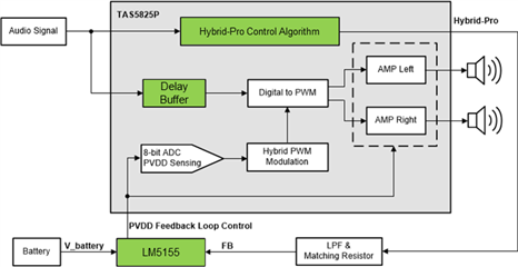 TAS5825P為德州儀器2019年新推出的數(shù)字輸入D類(lèi)功放芯片。該芯片內(nèi)置強(qiáng)大的音頻 DSP 內(nèi)核,實(shí)現(xiàn)了一種稱(chēng)為 Hybrid-Pro 的專(zhuān)有算法。Hybrid-Pro算法可檢測(cè)即將發(fā)生的音頻功率需求,并通過(guò)反饋引腳 (HPFB) 為DC/DC變換器提供 PWM 控制信號(hào)來(lái)調(diào)整輸出電壓(即D類(lèi)功放的電源電壓 PVDD)。TAS5825P 支持高達(dá) 4ms 的延遲緩沖器 (Delay Buffer),以提前查看音頻信號(hào)并防止音頻削波失真。