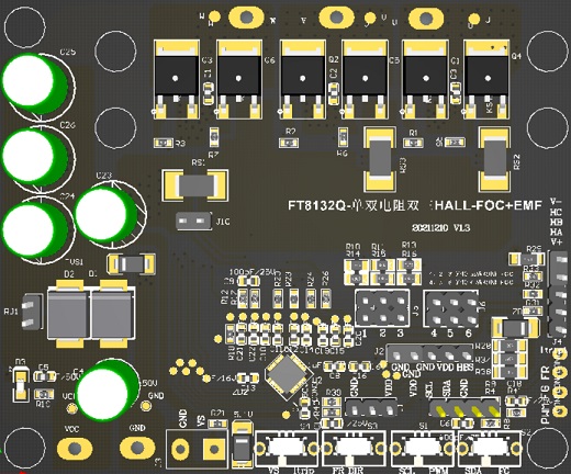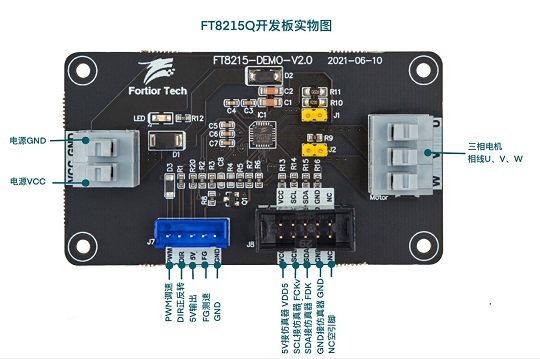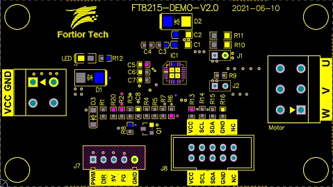 FT8215Q開(kāi)發(fā)板是為開(kāi)發(fā)者而設(shè)計(jì)的專用測(cè)試板,開(kāi)發(fā)板留有電源接線端、U/V/W接線端、仿真器插座、各功能接口。開(kāi)發(fā)者可仿真調(diào)試電機(jī)和通信燒錄IC,以及測(cè)試PWM/VSP調(diào)速、正反轉(zhuǎn)控制、FG測(cè)速等功能。