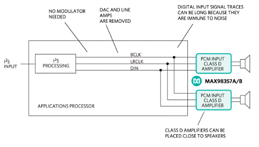 由于其高效率和出色的EMI性能,無(wú)濾波器數(shù)字輸入D類放大器已成為消費(fèi)電子設(shè)備中驅(qū)動(dòng)揚(yáng)聲器的公認(rèn)標(biāo)準(zhǔn)。這是因?yàn)樗鼈儾皇芘c模擬對(duì)應(yīng)物相關(guān)的電路板設(shè)計(jì)問(wèn)題的影響,最具體地說(shuō)是信號(hào)完整性。單通道數(shù)字D類放大器可以放置在電路板上的遠(yuǎn)程位置,以最大限度地減少大電流電池和揚(yáng)聲器負(fù)載連接的布線。這些放大器不需要模擬輸入D類設(shè)計(jì)所需的DAC和線路驅(qū)動(dòng)器。因此,空間和系統(tǒng)成本下降,設(shè)計(jì)變得更加簡(jiǎn)單。許多D類放大器接受脈沖編碼調(diào)制(PCM)或I類放大器2需要三根導(dǎo)線的 S 數(shù)據(jù):BCLK、LRCLK 和 DIN(圖 2)。PCM 數(shù)據(jù)格式不需要調(diào)制器或應(yīng)用處理器上數(shù)據(jù)的上采樣來(lái)提供立體聲數(shù)據(jù)。
