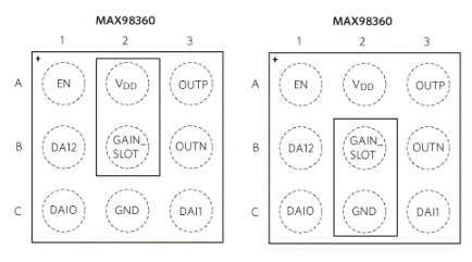 該 IC 還具有其他一些顯著優(yōu)勢(shì),有助于最大限度地減小電路板尺寸/成本。首先,它有1.9毫米的微小尺寸。29 引腳 WLP 具有巧妙的引腳布局,旨在消除對(duì)昂貴電路板過(guò)孔的需求。如圖4所示,GAIN_SLOT引腳(位于封裝中心)可以方便地連接到VDD或 GND(直接或使用電阻器)或保持未連接狀態(tài),以提供 I2S/左對(duì)齊增益設(shè)置如表1所示。