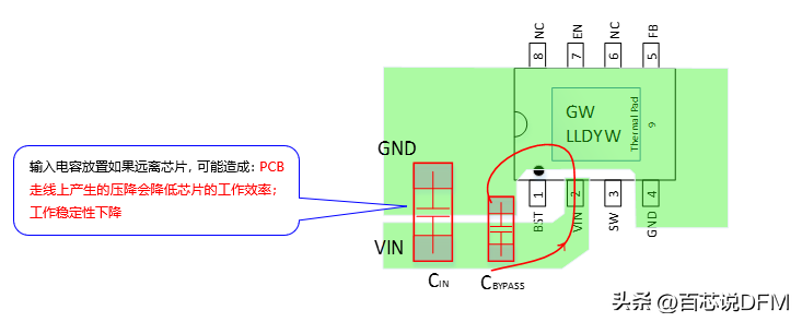 1、對(duì)于BUCK芯片而言,要想使輸入環(huán)路盡可能小,輸入電容應(yīng)盡可能靠近芯片引腳放置。