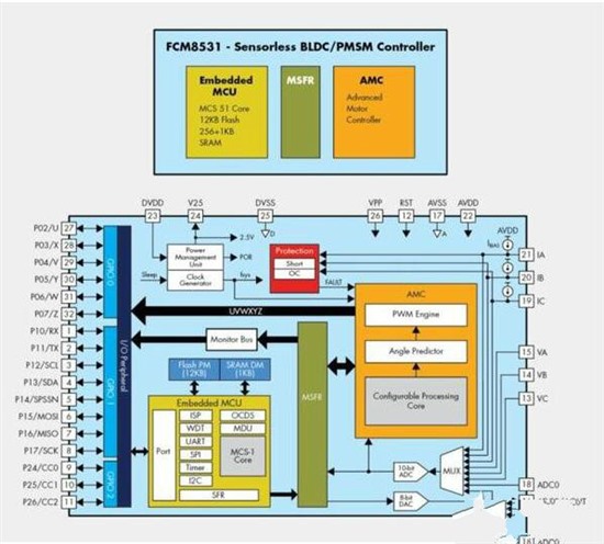 針對采用無傳感器磁場導向控制 (FOC) 的系統(tǒng),快捷半導體提供了一種配置有并行核心處理器的特定應用控制裝置 FCM8531。 如圖 1 所示,F(xiàn)CM8531 由一個先進馬達控制器 (AMC) 處理器和一個 8 位兼容 80C51 的 MCU 處理器組成。