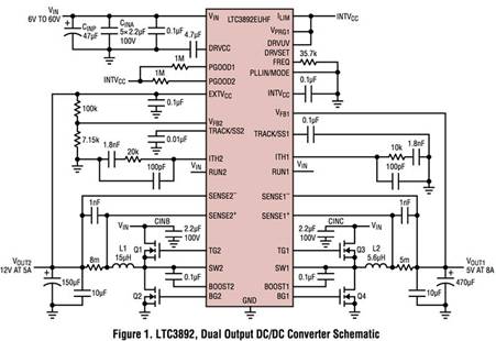 圖 1 顯示了單個 LTC3892、雙輸出解決方案:在 5A 時輸出 12V,在 8A 時輸出 5V。LTC3892 控制兩個電源系,每個都有一對開關(guān) MOSFET、電感器和輸出濾波器。該電路展示了通過對 V PRG1引腳進行編程將 V OUT1 設(shè)置為固定電平的能力 。在此示意圖中,它設(shè)置為 5V 1;因此,V OUT1 直接連接到 FB1 引腳。通過將 DRVSET 引腳連接到 INTV CC引腳來選擇標準柵極驅(qū)動電平 。