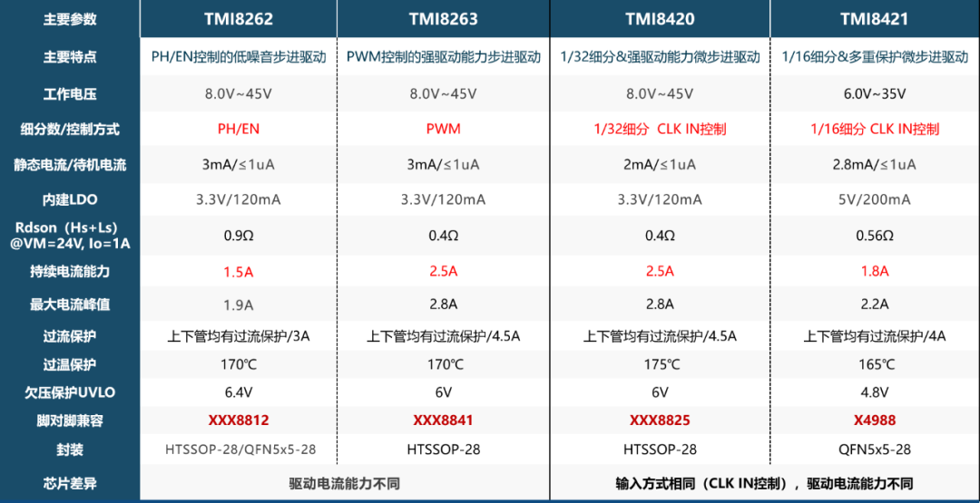 TMI8262是PH/EN控制的低噪音步進(jìn)驅(qū)動(dòng),TMI8263是PWM控制的強(qiáng)驅(qū)動(dòng)能力步進(jìn)驅(qū)動(dòng)。TMI8262和TMI8263主要區(qū)別是驅(qū)動(dòng)電流能力不同。TMI8420是1/32細(xì)分&強(qiáng)驅(qū)動(dòng)能力微步進(jìn)驅(qū)動(dòng),TMI8421是1/16細(xì)分&多重保護(hù)微步進(jìn)驅(qū)動(dòng).TMI8420和TMI8421輸入方式相同,驅(qū)動(dòng)電流能力不同。