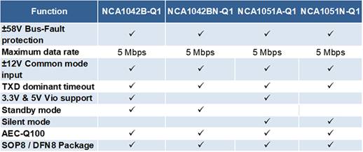 NCA1042x-Q1提供低電流的Standby模式,可以通過主控制器或者總線喚醒,NCA1051x-Q1提供低功耗的Silent 模式,并且兩者在斷電后都脫離總線;同時,NCA1042x-Q1和NCA1051x-Q1 在normal mode下都具有TXD 超時功能,而NCA1042x-Q1在待機模式下還支持總線超時功能,兩者總線耐壓范圍在-58V~+58V之間,支持過溫和過流保護功能。