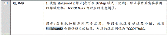 3.將TCOOLTHRS設(shè)置為高于TSTEP的值,并啟用sg_stop使能堵轉(zhuǎn)停止功能。確保電機(jī)在停機(jī)時(shí)安全停止。如果電機(jī)在堵轉(zhuǎn)發(fā)生前停止,增加SGT。通過禁用sg_stop或讀并寫入RAMP_STAT寄存器(寫+清除功能)重新啟動(dòng)電機(jī)。