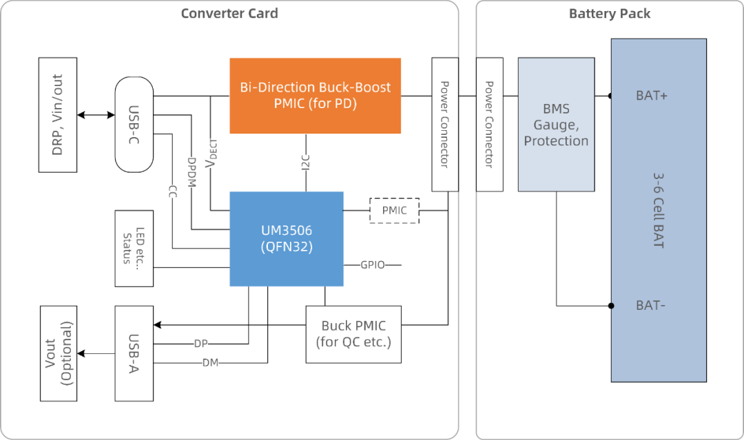 UM3506實現(xiàn)PD DRP協(xié)議,電源管理,并可與外置的電池包上的BMS進行通信,支持私有協(xié)議監(jiān)控電芯狀態(tài),確保充放安全