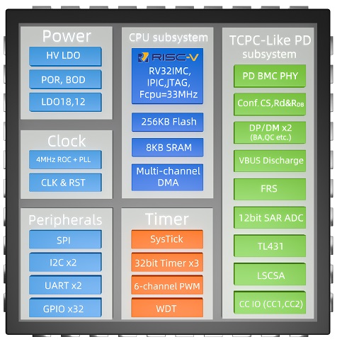 UM3506芯片集成了USB PD 3.0, PD3.1控制器和一個更加具有開放性,靈活性的RISC-V 內核處理器。該系列產品可以用來支持增強型PD應用。該款芯片全面滿足USB開發(fā)者論壇組織定義的USB3.1標準集里面的相關規(guī)范。