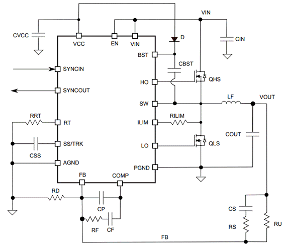 輸入級(jí)組件包括組成PI 網(wǎng)絡(luò)的大容量電容器、濾波電路(C4、C5 和 L1),以減輕高頻開關(guān)操作引起的高頻射電輻射。輸入直流總線電壓連接控制器的VIN引腳(引腳20),在路徑中有串聯(lián)電阻。VIN為控制器內(nèi)部電路供電,同時(shí)供給內(nèi)部LDO穩(wěn)壓器,以產(chǎn)生 7.5V的Vcc 輸出電壓。VIN還是內(nèi)部柵極驅(qū)動(dòng)器的電源。在引腳 20上需要連接一個(gè)小的MLCC 電容。通過輸入分壓電路在使能引腳(引腳 1)上施加偏壓,以便在 40V時(shí)啟用控制器,避免電池深度放電。一旦EN/UVLO引腳電壓超過1.2 V 典型值,軟啟動(dòng)階段就會(huì)開始,SS/TRK 引腳電壓上升,控制器啟動(dòng)。為了在40V最小輸入電壓時(shí)控制器能夠運(yùn)行,電阻器 R1 和 R6的阻值分別選擇100K 和 4.7K。為確?刂苹芈方^對(duì)穩(wěn)定,并不受電容器類型的影響,控制器實(shí)現(xiàn)了 III 型補(bǔ)償器,為開發(fā)者提供了兩個(gè)零點(diǎn)和三個(gè)極點(diǎn),確保相位裕度足以提高階躍負(fù)載的性能。